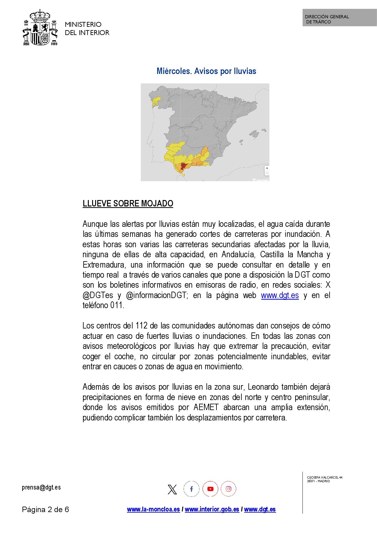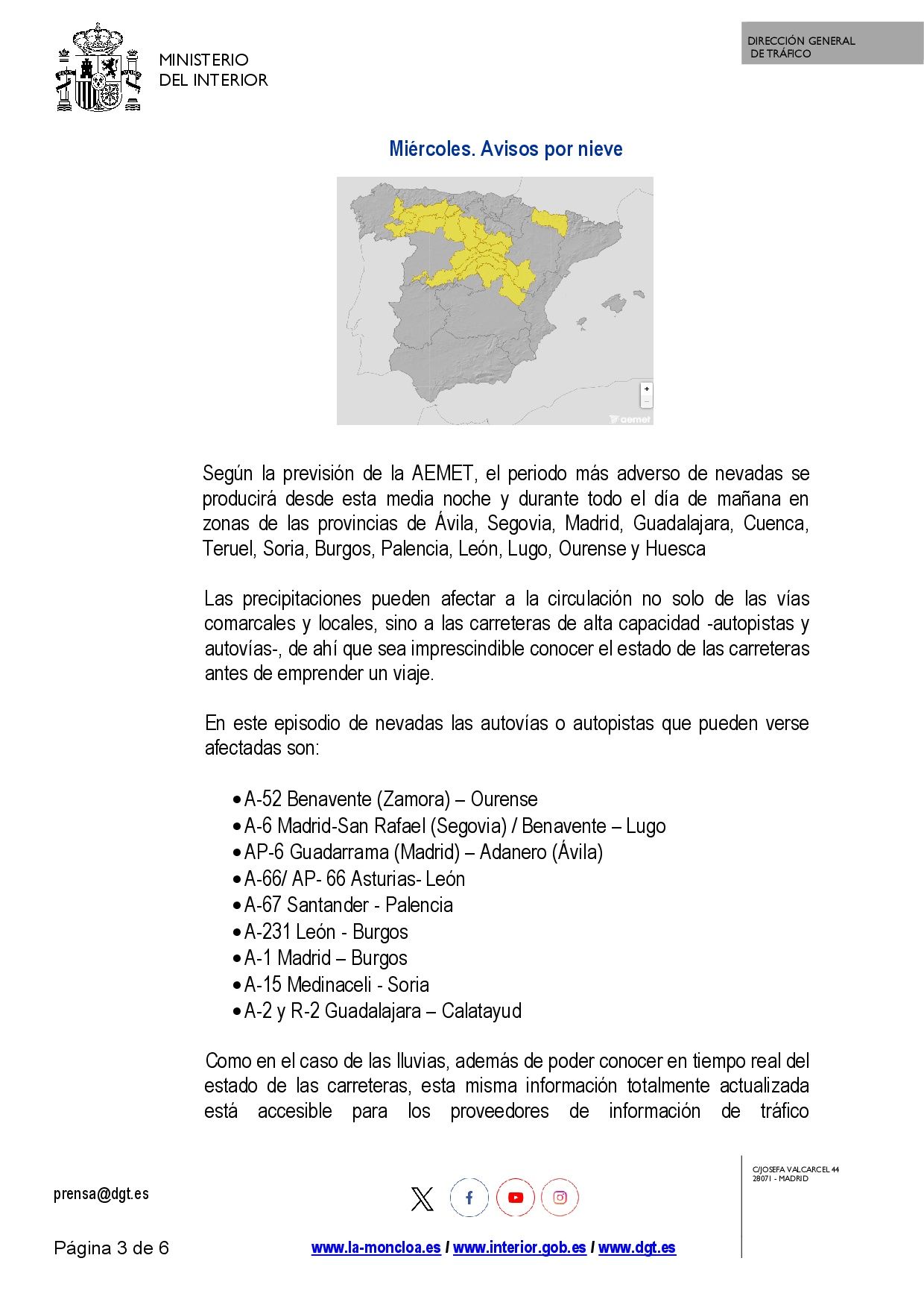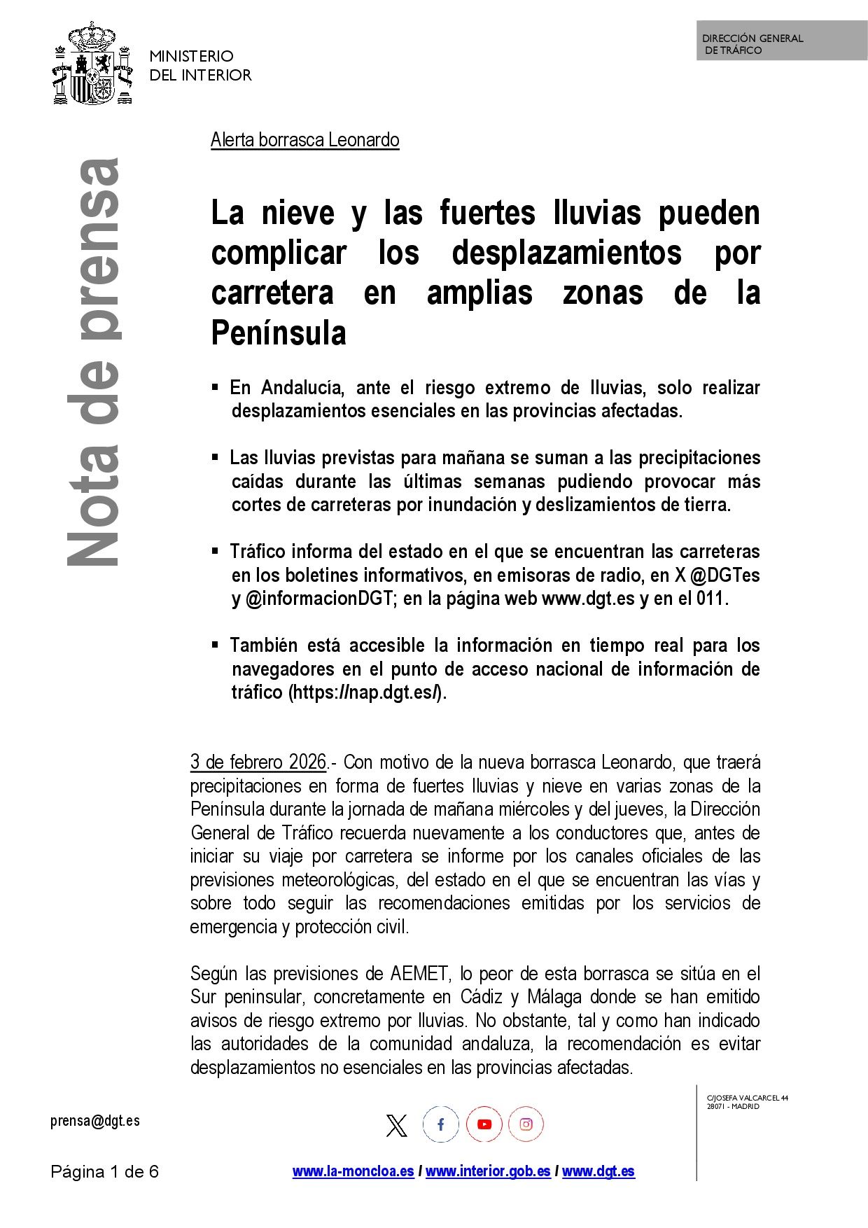 Se adjunta nota de prensa de la Dirección General de Tráfico sobre este nuevo episodio de nieve y lluvia motivado por la borrasca Leonardo.