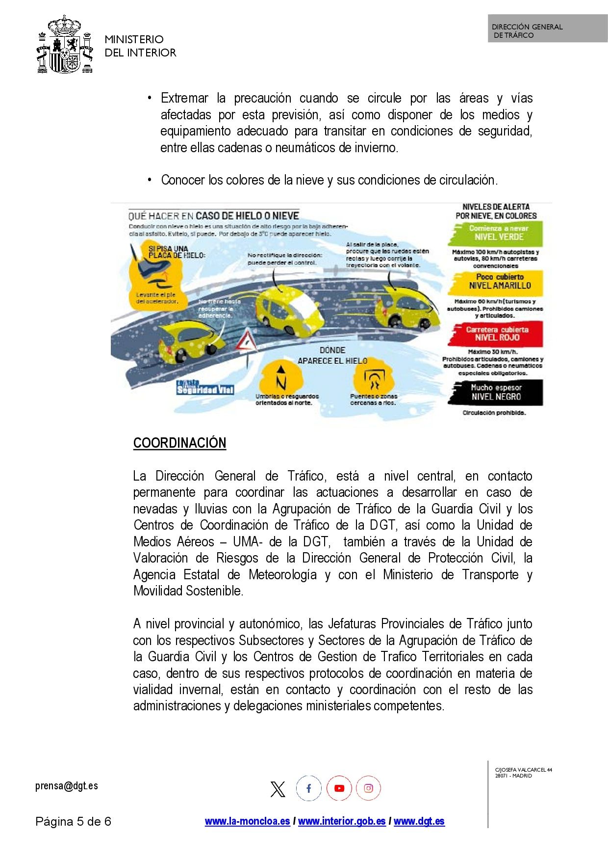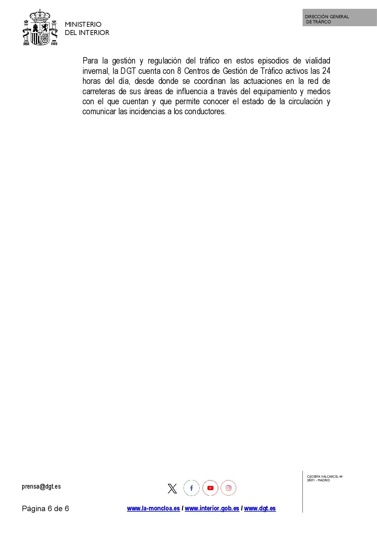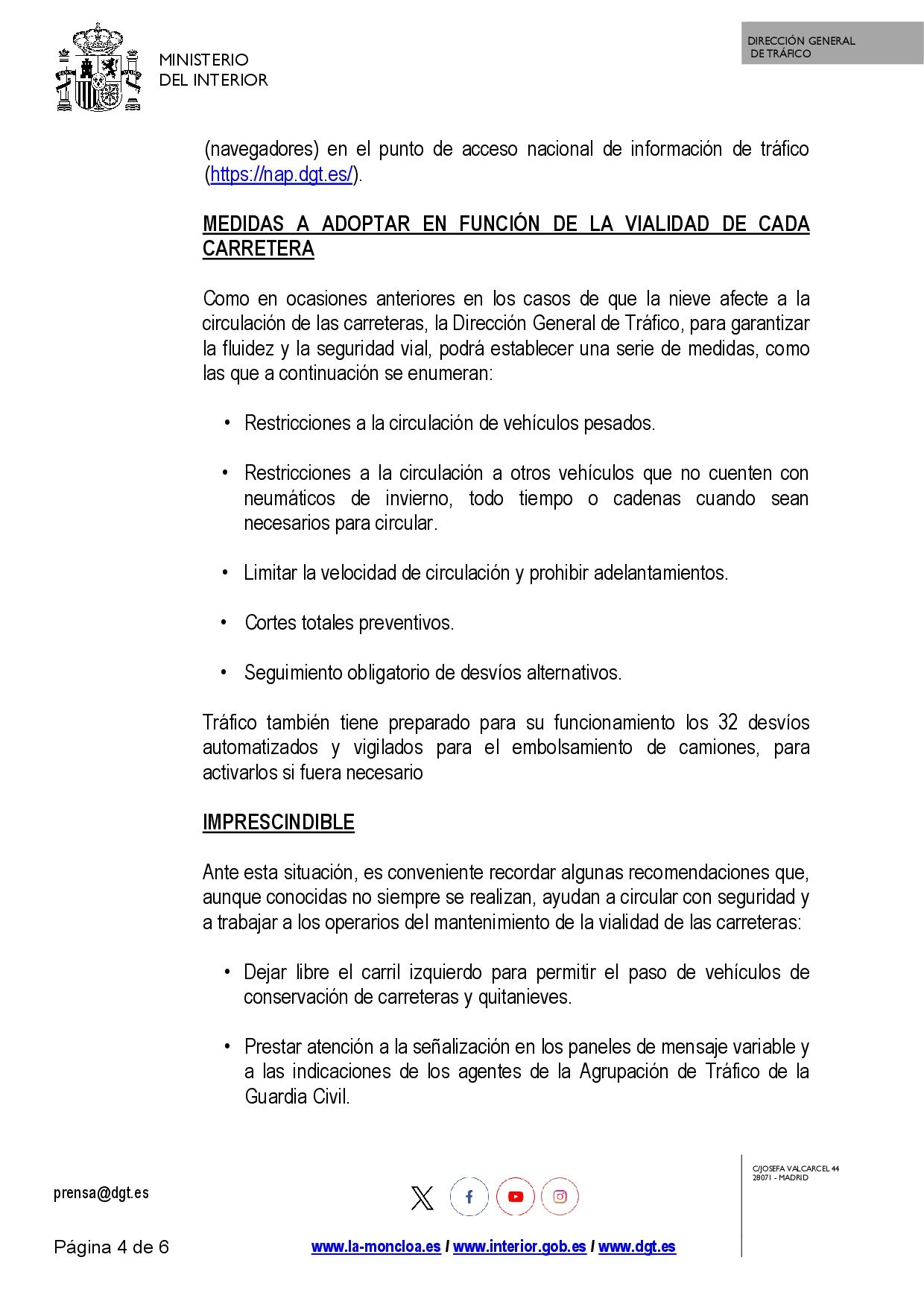 Se adjunta nota de prensa de la Dirección General de Tráfico sobre este nuevo episodio de nieve y lluvia motivado por la borrasca Leonardo.