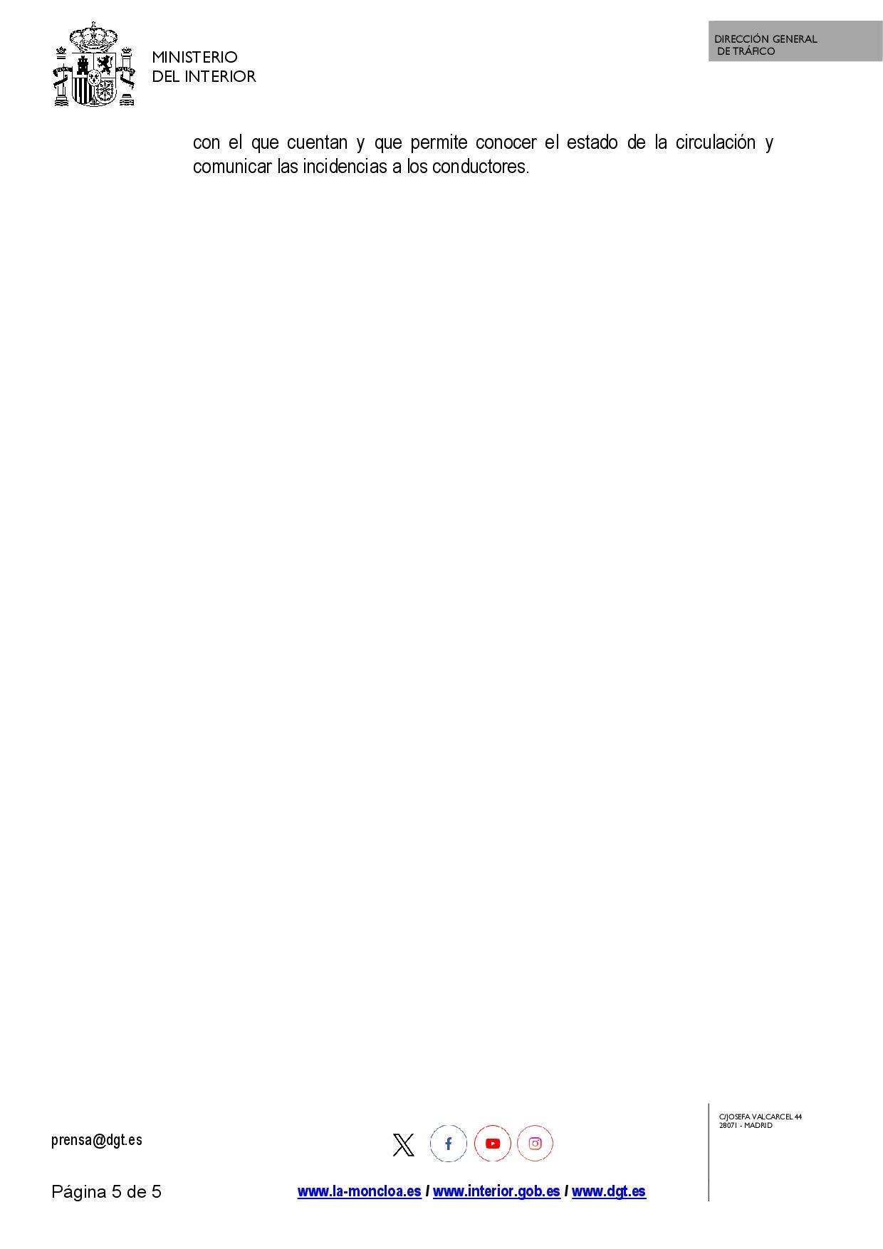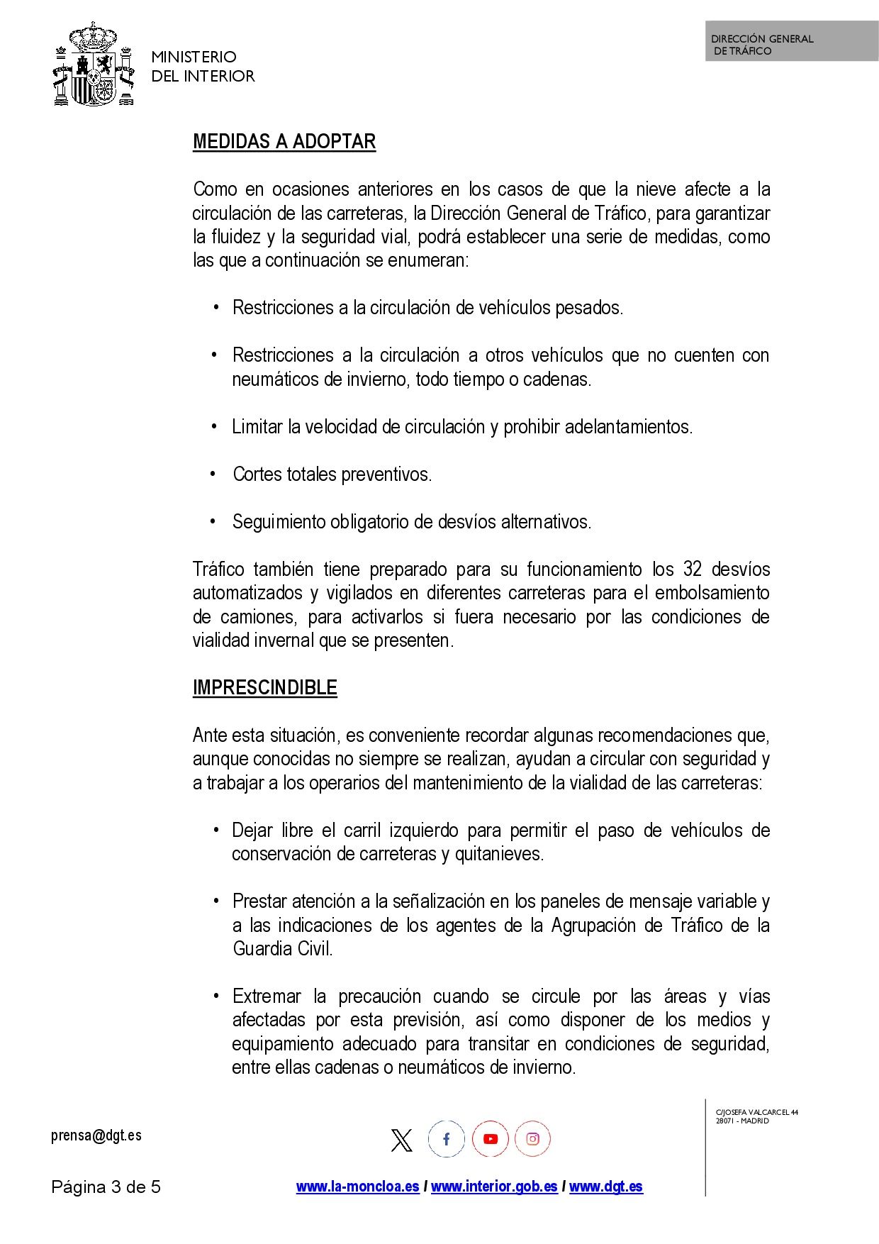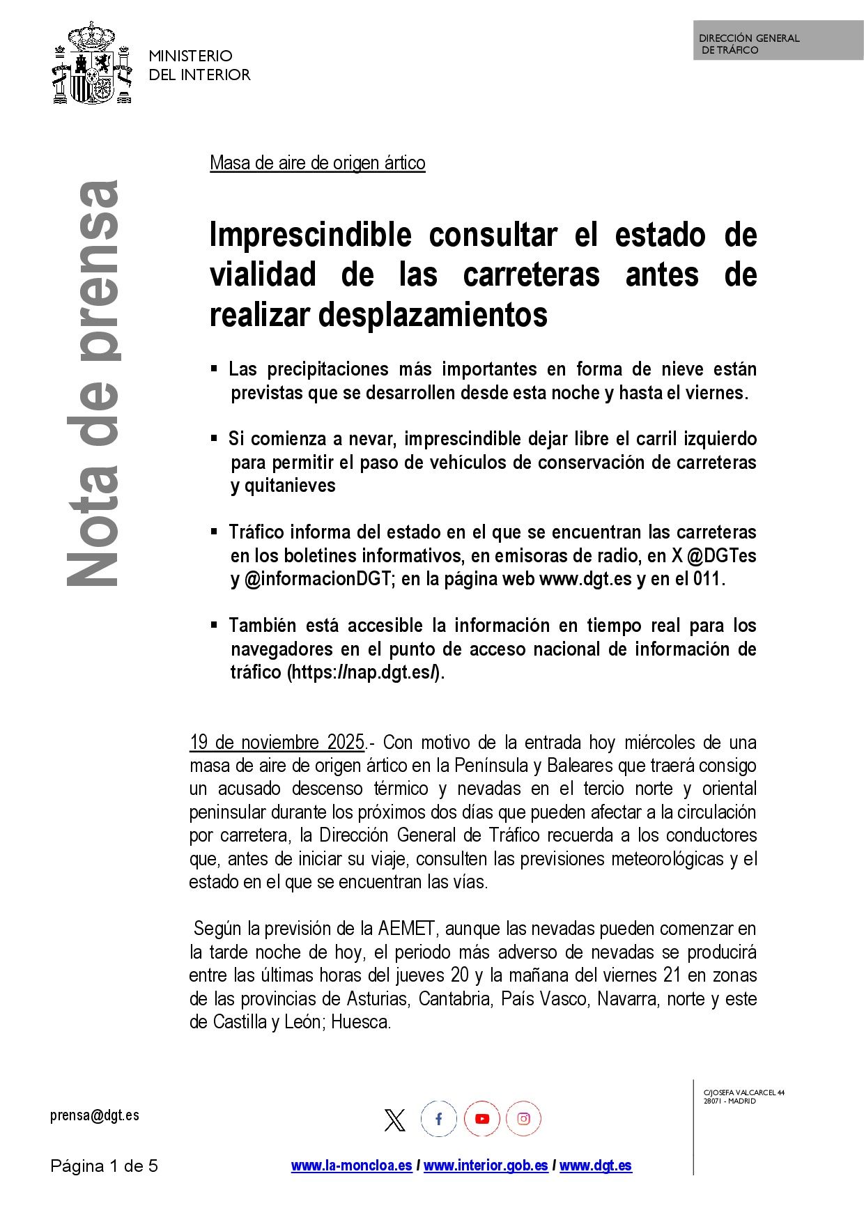 Le hacemos llegar en documento adjunto la nota de prensa emitida hoy por el Ministerio del Interior alertando de caída brusca de temperaturas y posibles nevadas que pueden afectar al tránsito en carreteras.