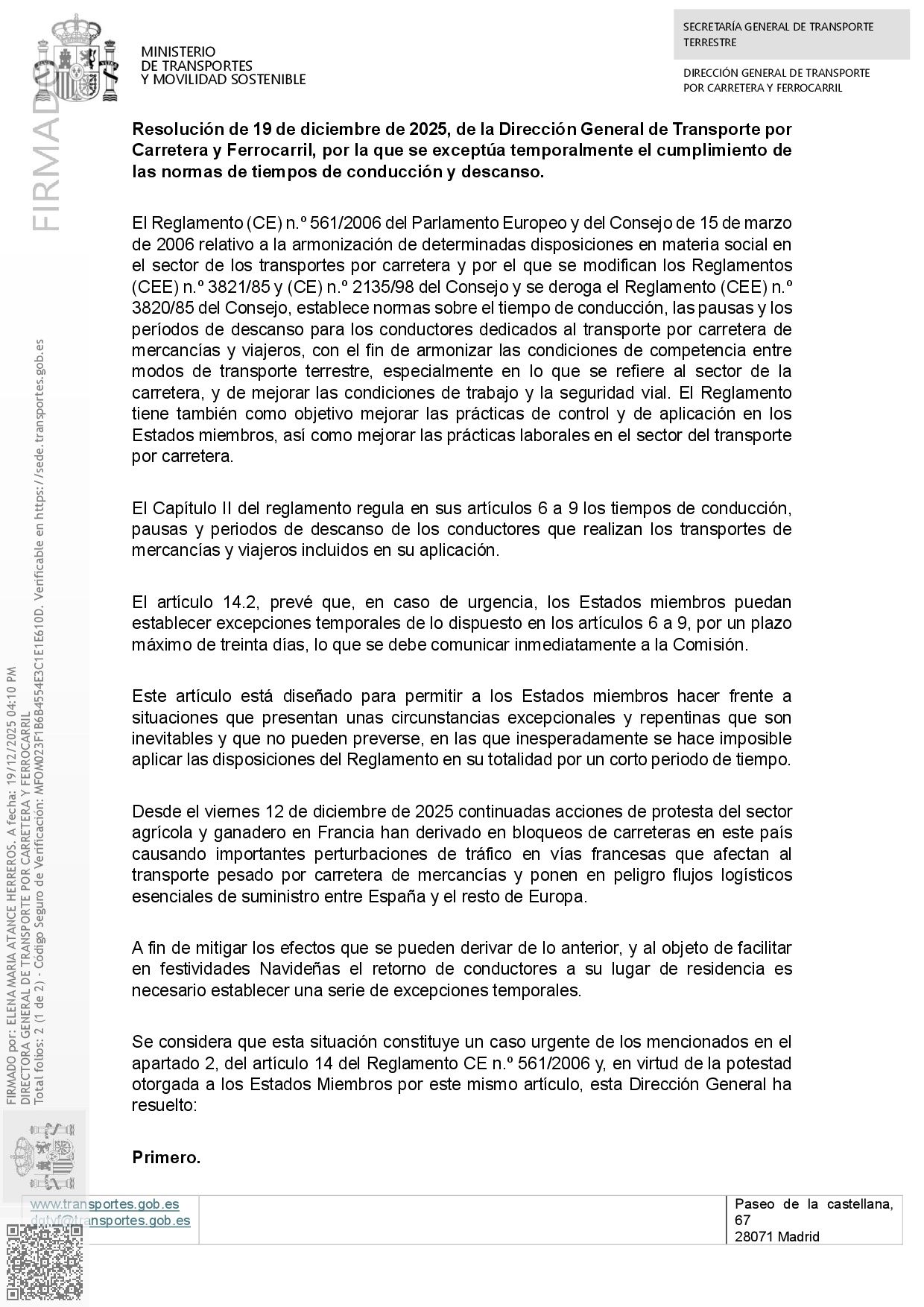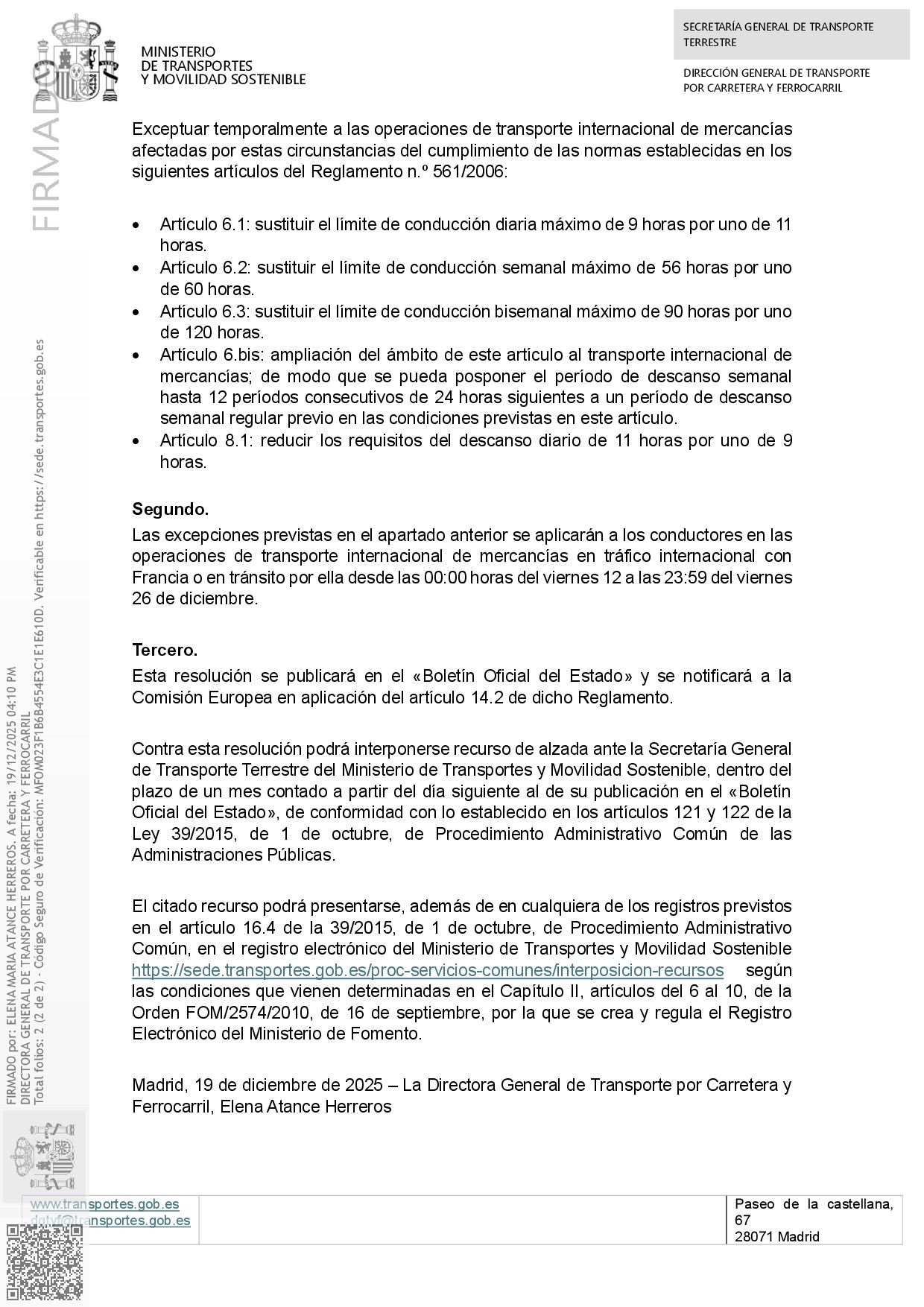 El principal ánimo de esta resolución, tal como habíamos estado compartiendo con el equipo de la Dirección General de Transporte por Carretera, es facilitar el regreso de los chóferes a sus bases a tiempo de disfrutar las fiestas de Nochebuena y Navidad. Queremos expresar aquí nuestro agradecimiento al equipo de Doña Elena M. Atance por la comprensión y celeridad demostradas.